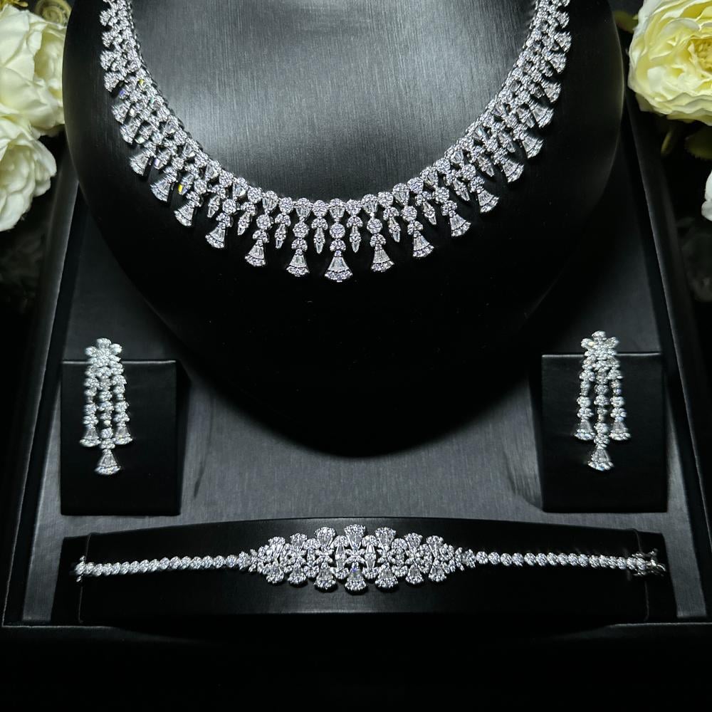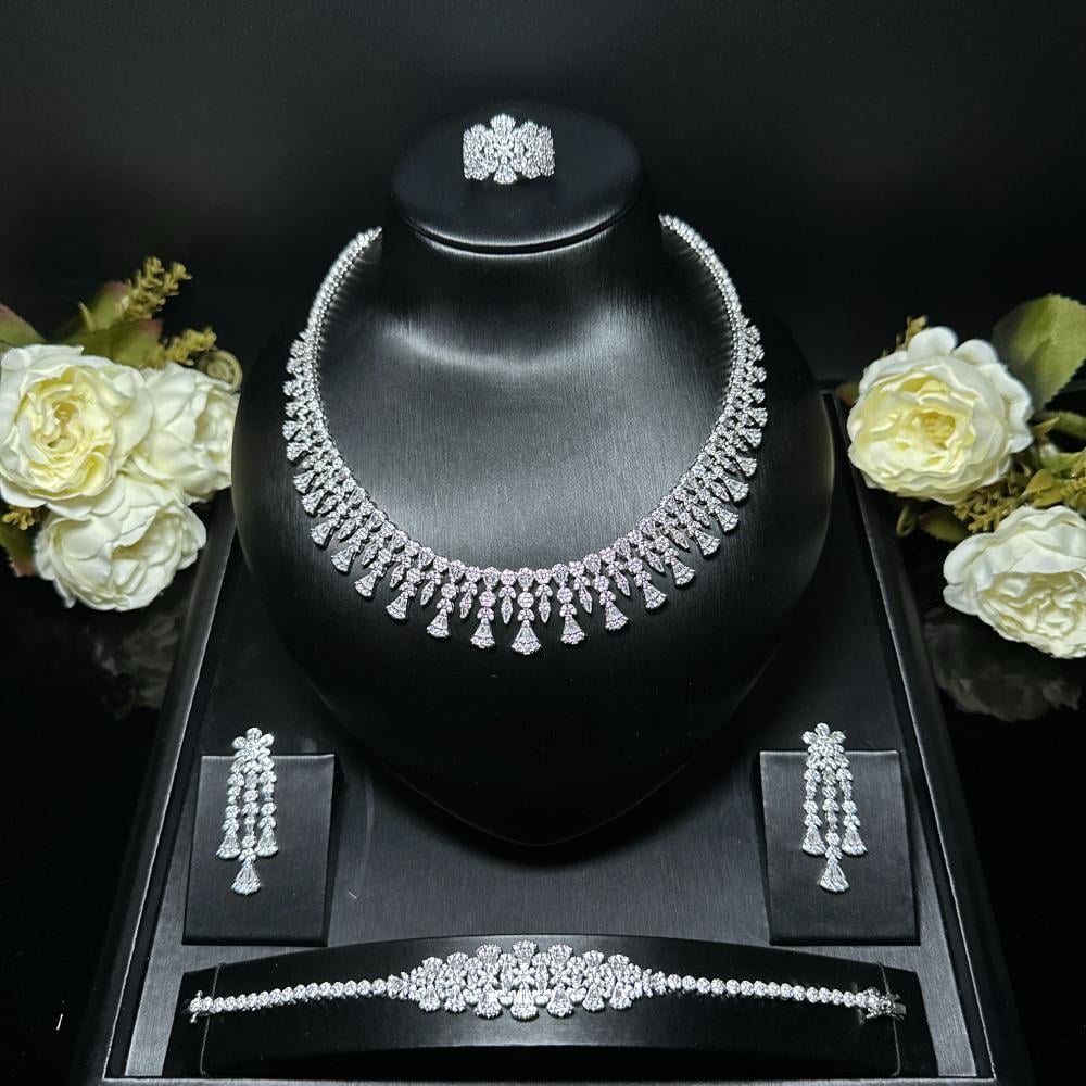 كملي إطلالتك الملكية مع هذا الطقم المذهل المصمم بدقة وأناقة. يتميز الطقم بقلادة براقة بتصميم أنيق يلفت الأنظار، أقراط متدلية تضيف لمسة من الجاذبية، سوار فاخر، وخاتم متناسق يعبر عن الفخامة والرقي. مصنوع من زركون عالي الجودة ليضفي لمسة فريدة من التألق المثالي للمناسبات الخاصة والسهرات.