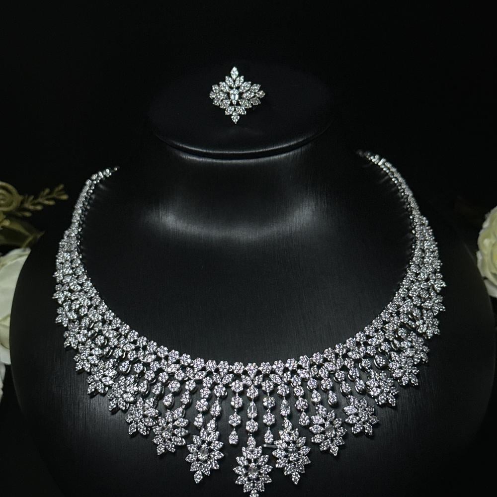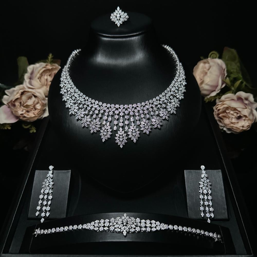 طقم إكسسوارات نسائي فاخر من الزركون المتألق بتصميم ملكي فريد يناسب السهرات والمناسبات الراقية. يحتوي الطقم على عقد مميز وأقراط وسوار وخاتم بتفاصيل براقة تعكس الأناقة والفخامة. الطقم يجمع بين البساطة والجاذبية ليكون الاختيار المثالي لإطلالة تخطف الأنظار.